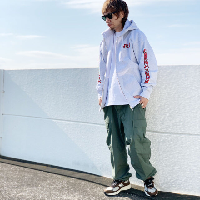 フロント、バック、両袖にまでプリントを落とし込んだ存在感のあるジップフーディーになります。 袖には"LOCALS ONLY"のフレーズをプリントしています。