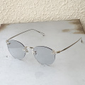 クラックの発生を少なくしたポリアミド樹脂のレンズを採用し、クラシックなレンズシェイプのリムレスフレームにオリジナルライトカラーレンズを合わせてモードな印象にもなるスタイルに仕上げた。