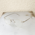 クラックの発生を少なくしたポリアミド樹脂のレンズを採用し、クラシックなレンズシェイプのリムレスフレームにオリジナルライトカラーレンズを合わせてモードな印象にもなるスタイルに仕上げた。