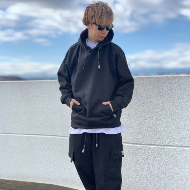 シンプルな無地アイテムながらもフードコードとポケット部分にピスネームが付属しさりげないアクセントになっています☆