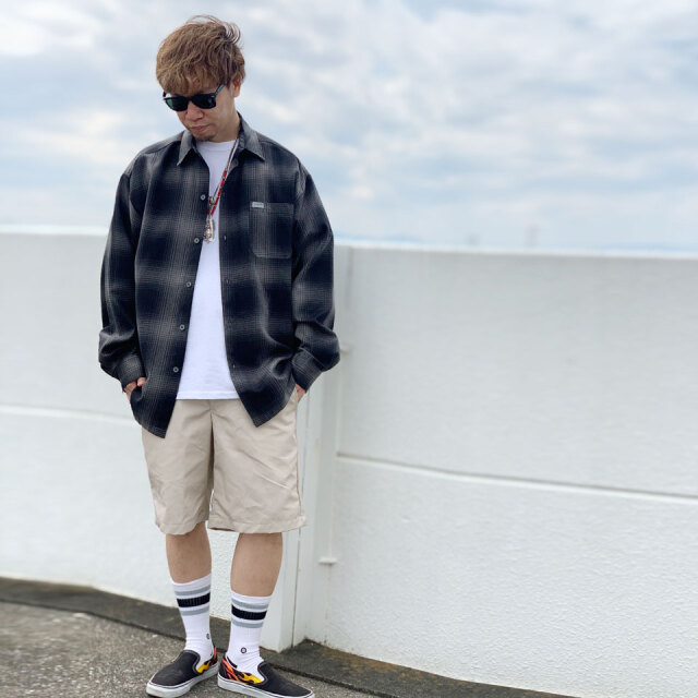 肝心要のシルエットは膝が隠れるぐらいの絶妙な丈感に加え、ワタリと裾幅も広めなボリューム感のある男臭い仕上がり!!