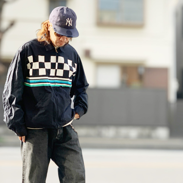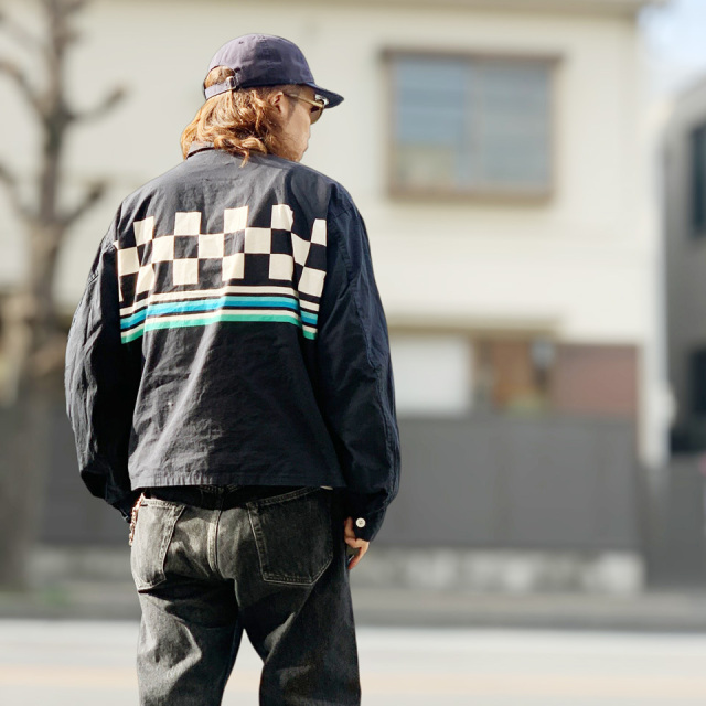 フロントとバックに落とし込まれたチェッカーパターンが70'sライクなレトロな雰囲気の一着に仕上がっています。