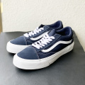 王道のアメカジスタイルとの相性も抜群のネイビーのオールドスクール。素材感が変わる事により他と差が付く一足に仕上がっています。