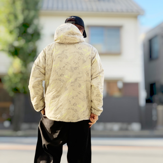 裏側はキルトレスのソリッドな仕上げ。左胸にはブランドネーム、袖口にもリフレクタープリントが落とし込まれています。
