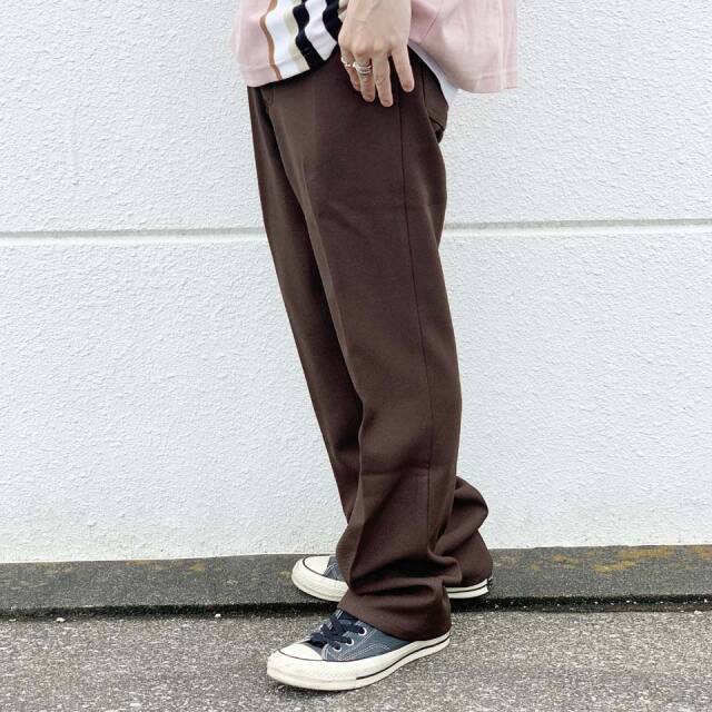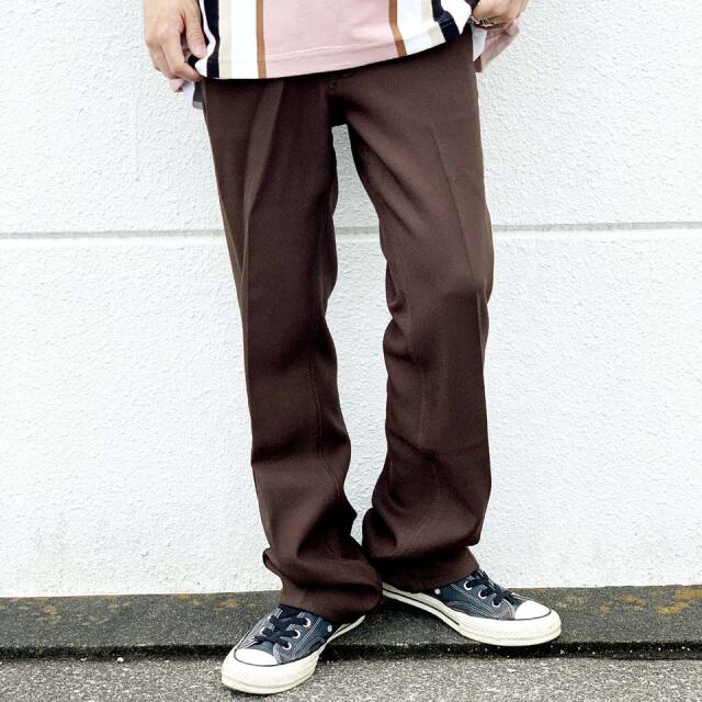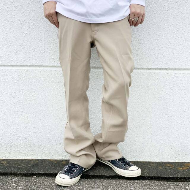 光沢のあるポリエステル素材を採用し、細身で裾がややフレアした、ドレッシーな雰囲気の一本です。