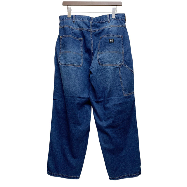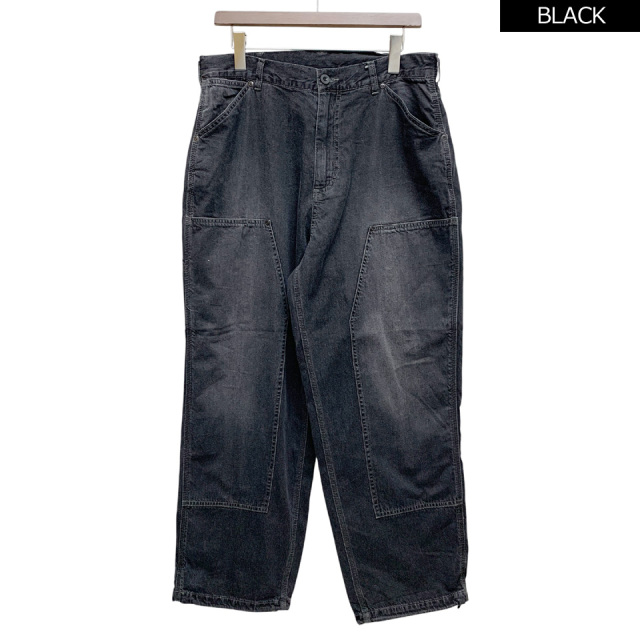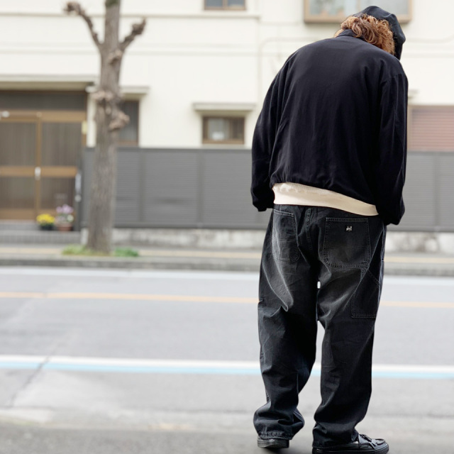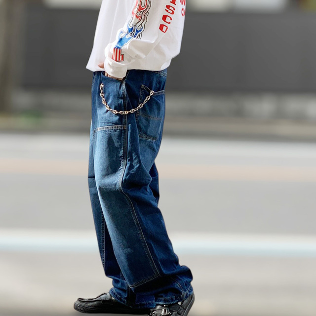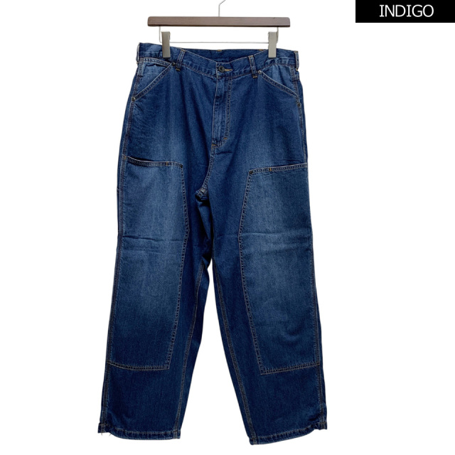 フロントのダブルニー仕様が特徴のゆったりしたシルエットのデニムパンツ。