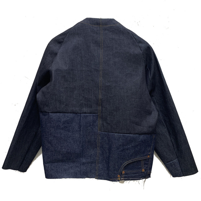 Levi's 501のリジッドデニム生地とアメリカ製のリジッドデニム生地とUSED Levi'sのデニム生地を組み合わせて縫製したアップサイクルのエンジニアジャケット。
